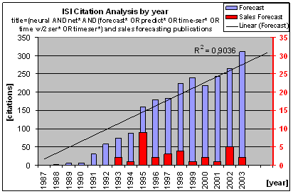 Fig.1: ISI citation analysis on neural networks for forecasting by year However, significant differences exist in modelling suitable architectures for business forecasting for each domains, depending on the forecasting objective, application and dataset. Firstly, a variety of ANN publications focus on nominal predictions for classification tasks, which induce different modelling heuristics of little use to derive point predictions through the metric predictions necessary for sales forecasting. In addition, sales forecasting often implies noisy time series with only a few years of monthly or weekly observations, due to structural breaks from launches, relaunches, new product introductions, listing and delistings etc. as opposed to long time series with a high signal-to-noise ratio often found in engineering, physics or artificial time series. As specific heuristics have been developed for distinct applications, we limit our analysis to publications to the sub-domain of sales forecasting, in order to derive robust recommendations for valid and reliable experiments. As a keyword search does not allow a valid separation of publications, we manually evaluated and eliminated all publications related to non-business and non-sales applications and nominal predictions or classifications, e.g. of marketing response rates, market shares, index prices, electrical load forecasting etc. and different application domains in order to derive homogeneous recommendations. We identified additional studies through a bottom-up follow up of citations and additional searches by author name and research group identified in IEEE Xlpore, ScienceDirect, Citeseer, Proquest and ABI/Inform. Our search yielded a total of 171 publications on time series or causal point predictions in business forecasting, in the categories of general publications on point predictions including examples from business, sales, marketing, production and finance.